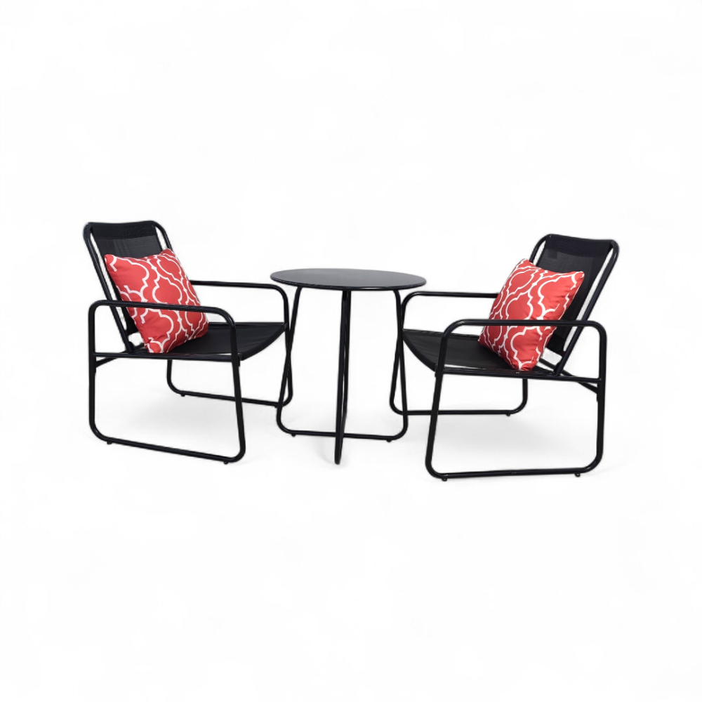 استمتع بأجواء الاسترخاء في الهواء الطلق مع جلسة تجمع بين التصميم العصري والراحة المثالية. تتكون من كرسيين مريحين بطابع أنيق وطاولة عملية، لتكون إضافة مثالية لشرفتك أو حديقتك أو حتى سطح منزلك.