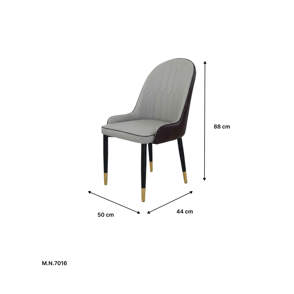 - أربعة كراسي بتصميم مميز، مكسوة بلون رصاصي على بني جلد، مع قاعدة من الحديد المتين لضمان الثبات والراحة. الكراسي مصممة بشكل مريح لتوفير تجربة جلوس مثالية.
