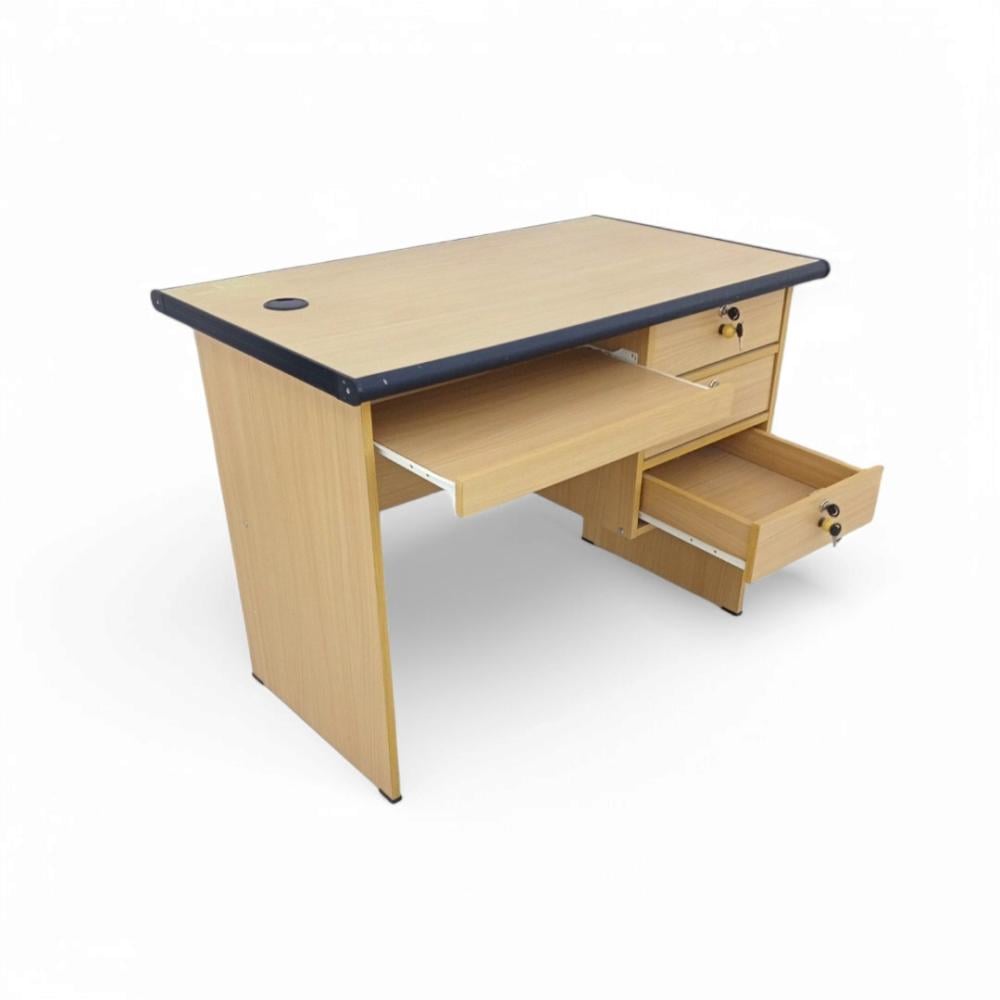 طاولة مكتب أنيقة وعملية مصنوعة من خشب MDF عالي الجودة، بتصميم عصري ولون خشبي دافئ يضفي لمسة أنيقة على أي مساحة عمل. تتميز بأدراج جانبية واسعة لتوفير مساحة تخزين منظمة للمستلزمات المكتبية، مما يجعلها مثالية للمكاتب المنزلية أو المكاتب الصغيرة.