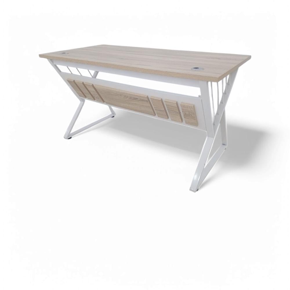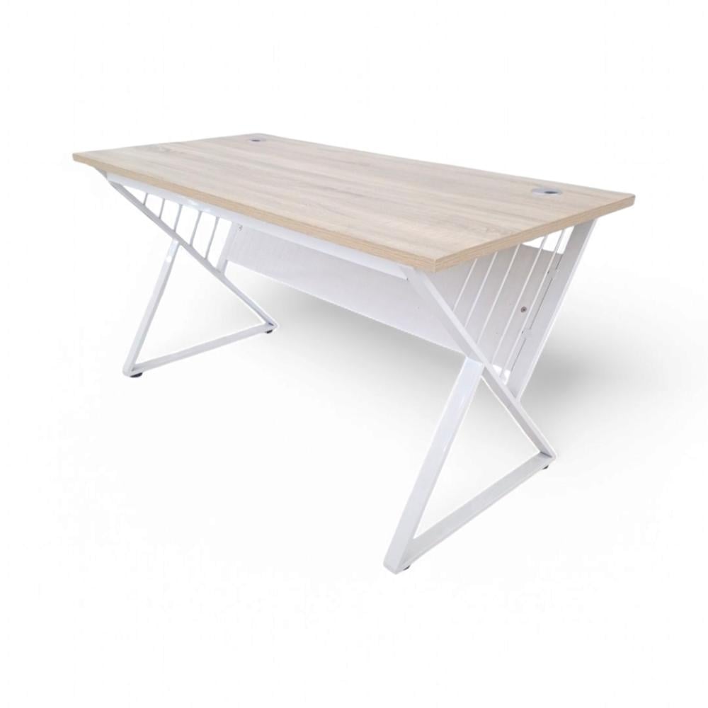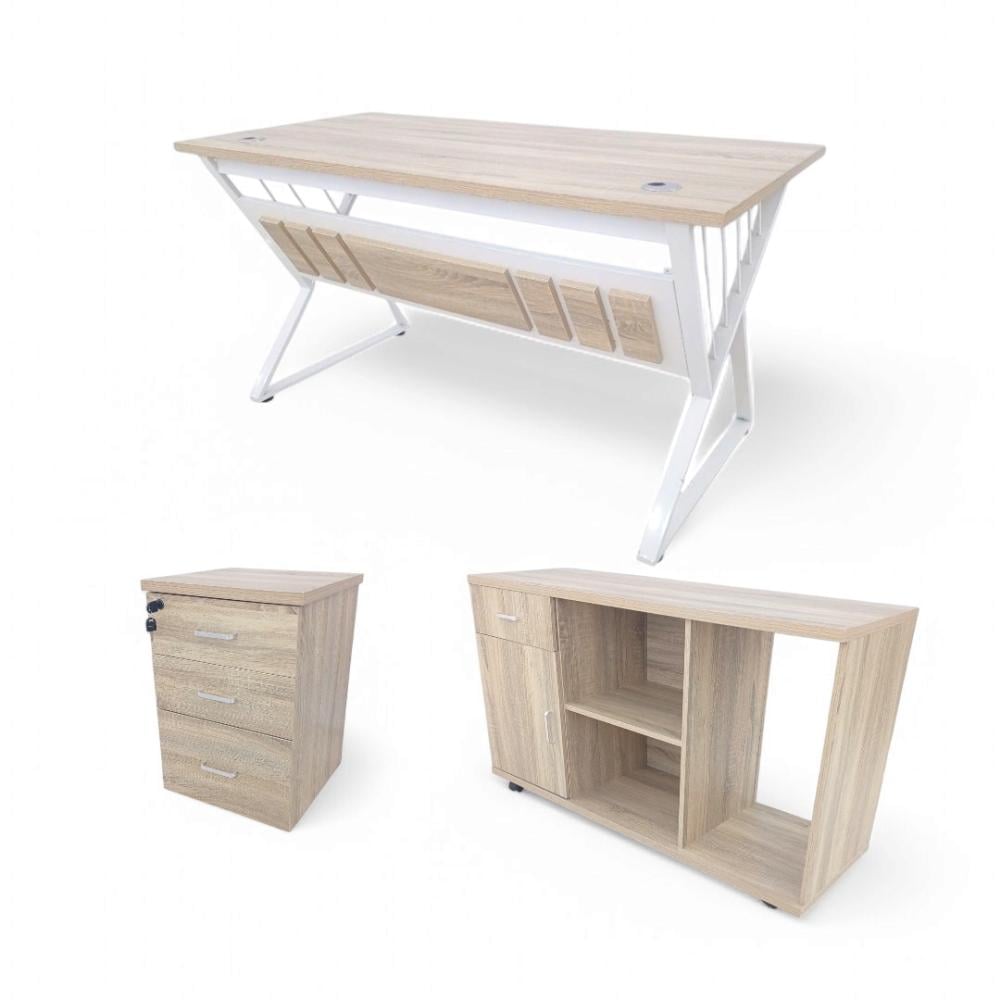 طاولة مكتب عمليّة وأنيقة مصنوعة من خشب MDF عالي الجودة، مثبّتة على قاعدة حديد متينة لتوفير ثبات وقوة تحمّل طويلة الأمد. تأتي الطاولة مع ملحق علوي (رف كتب أو دولاب صغير) وكمدينة (درج) لتنظيم الأوراق والمستلزمات المكتبية بكفاءة.