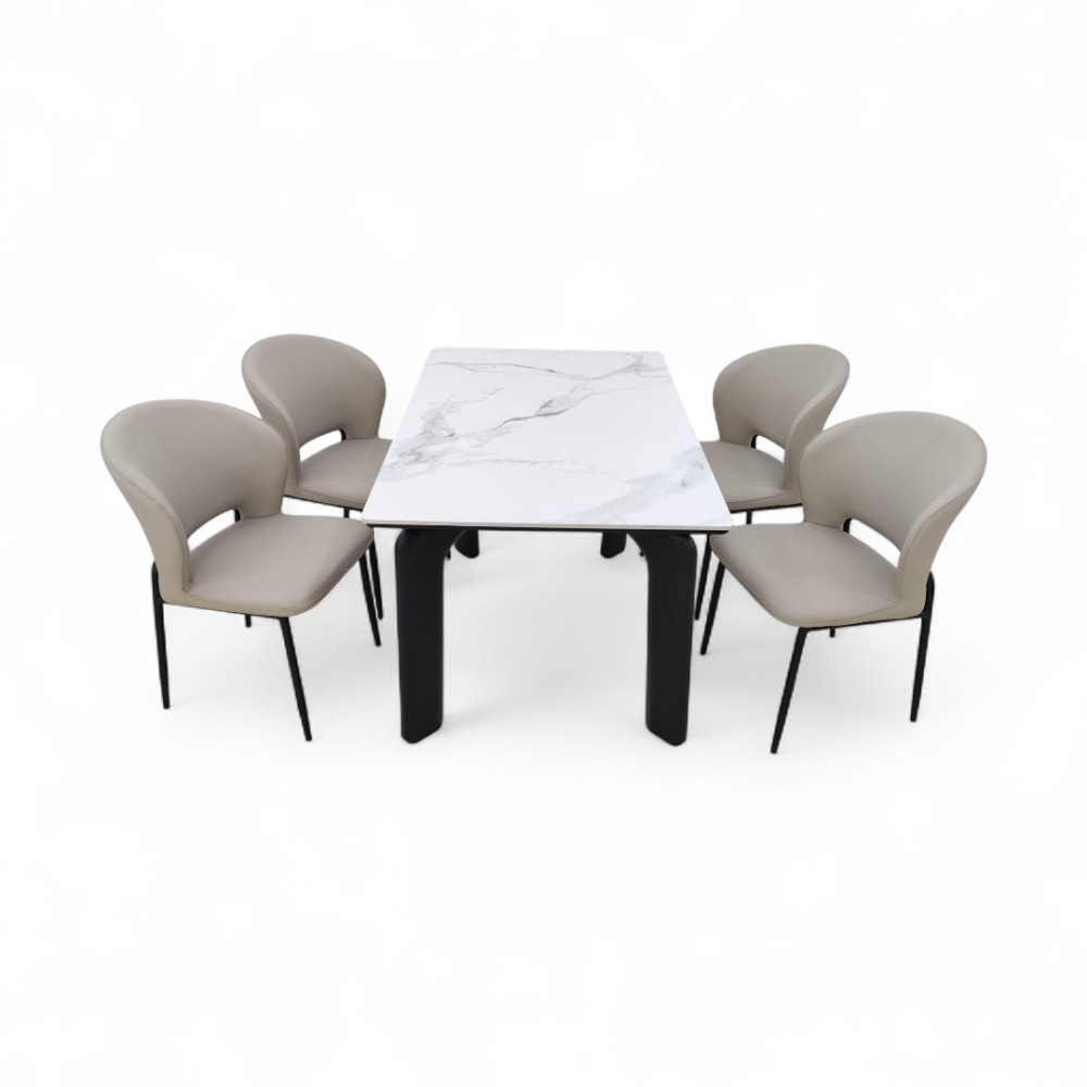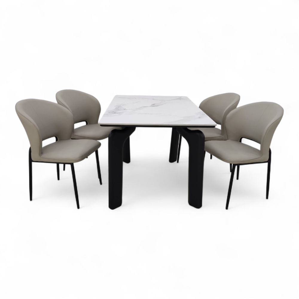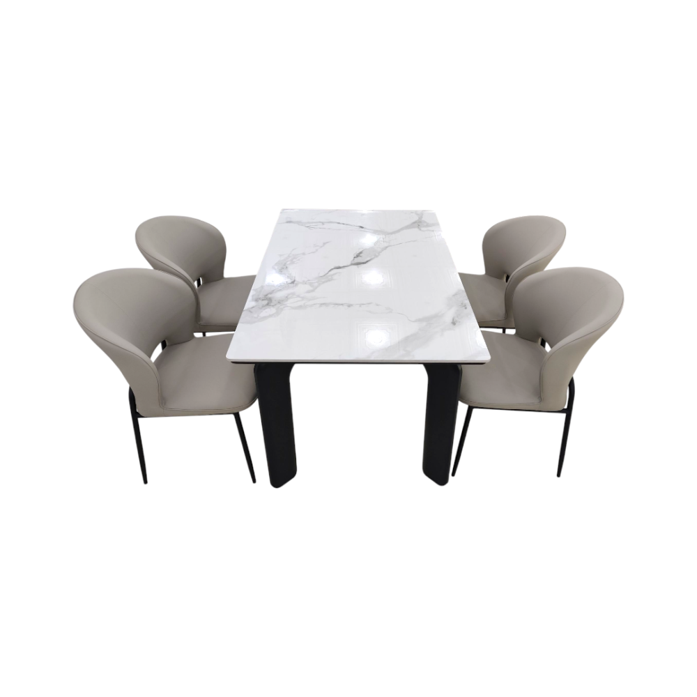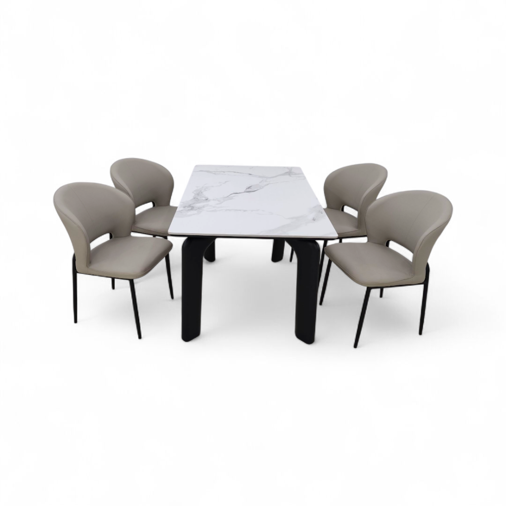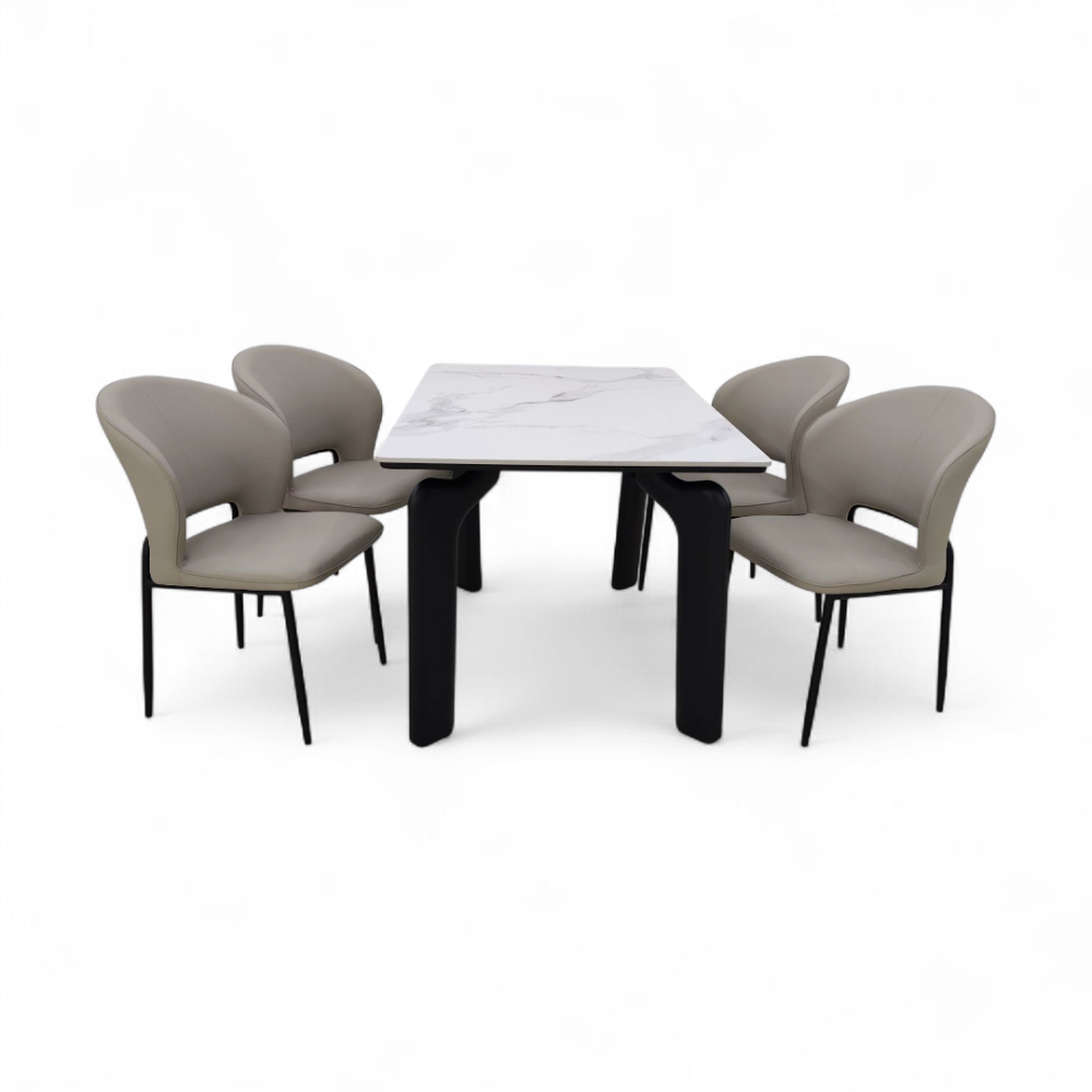 طاولة طعام أنيق وعصري مكون من طاولة رئيسية + 4 كراسي، يجمع بين التصميم الفاخر والمتانة العالية. الطاولة بسطح بورسلان أنيق يمنح مظهراً راقياً ومقاوماً للخدوش وسهل التنظيف، مع قاعدة حديد قوية تضمن الثبات. أما الكراسي فهي بتنجيد جلدي فاخر مريح مثبتة على قاعدة حديدية صلبة لتكمل الطقم بروعة عملية وفخامة تدوم.