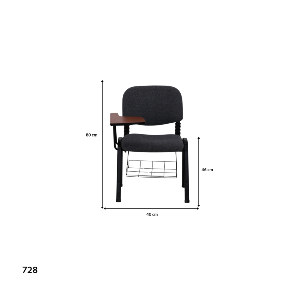كرسي للدراسة ب قماش مسند خشبي عريض لراحة الذراعين اثناء الدراسة. مع ارجل قوية من الحديد مع صندوق شبكي اسفل الكرسي للتخزين. متوفر باللون الاسود و الرمادي