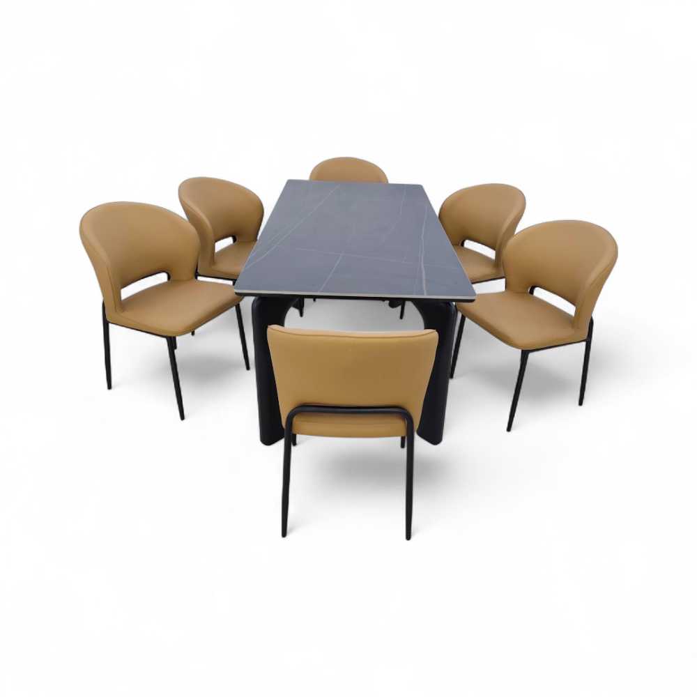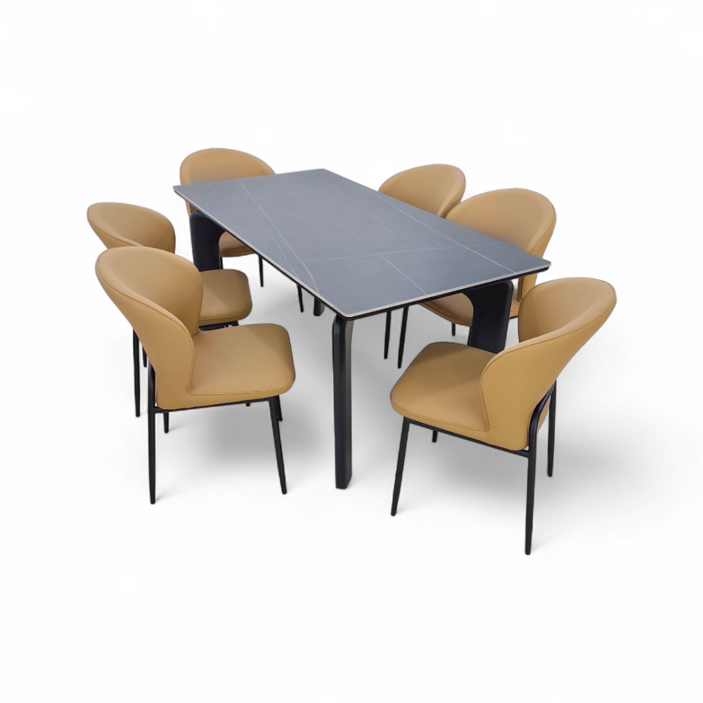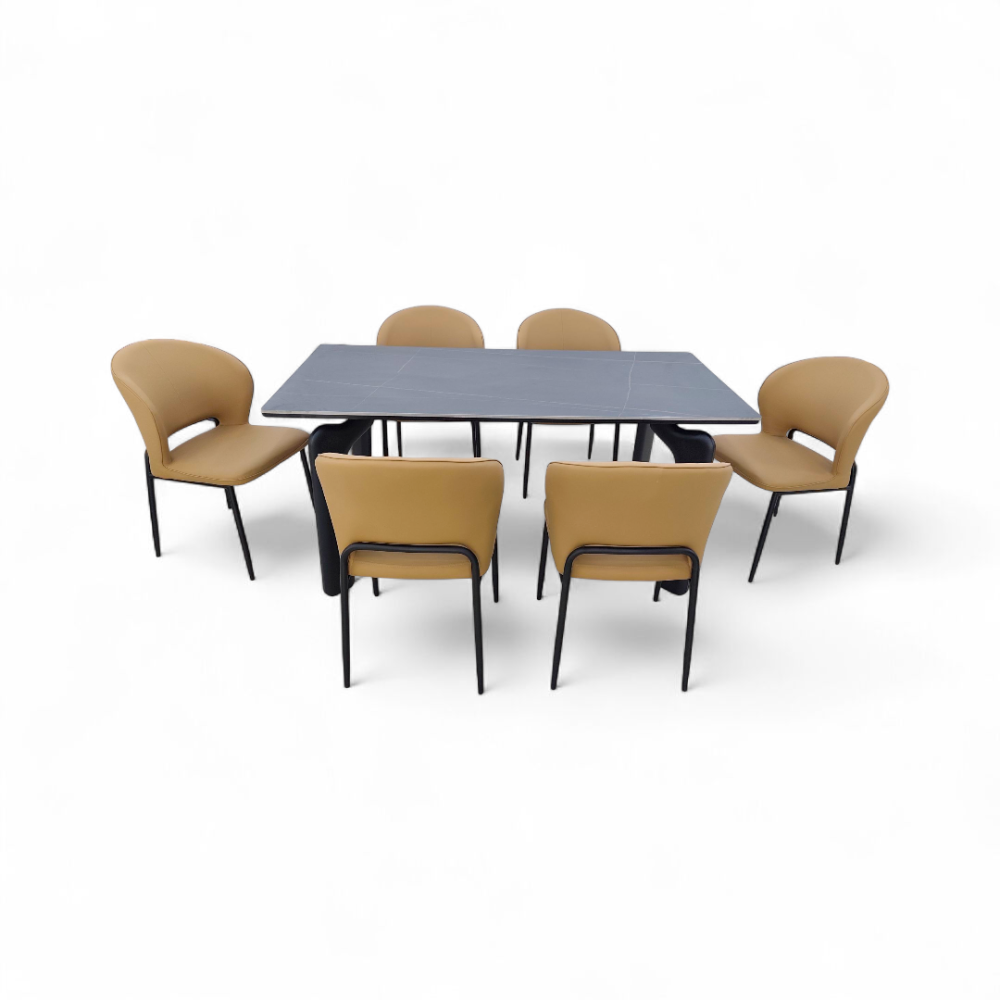 طقم طاولة طعام فاخر يتكون من طاولة رئيسية + 6 كراسي، يجمع بين الأناقة والمتانة ليمنحك تجربة مثالية في جلسات الطعام العائلية أو الضيافة. الطاولة مصممة بسطح بورسلان أنيق وقاعدة من الحديد المتين، فيما تأتي الكراسي بتنجيد جلدي مريح على قاعدة حديدية قوية، مما يضمن لك المتانة والفخامة معًا.